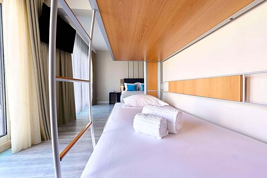 Spacious and comfortable rooms with a double bed and bunk beds with a private balcony, LCD TV, high-speed Wi-Fi, telephone, air conditioning and heating, mini-bar and safe.